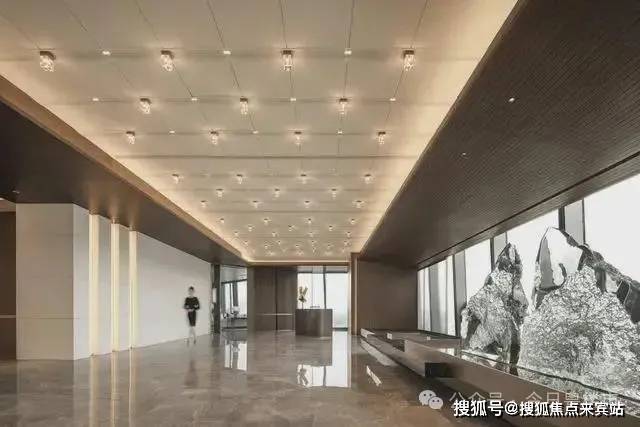 采用简约温暖的色调搭配天然木饰面与打磨成墙布效果的石材,柔和宁静。落地窗前,黑白与金棕系的落座区与下沉庭院的生态水景相映合,景观更提取了建筑折面元素,加之水花流淌的形态,张弛有度。