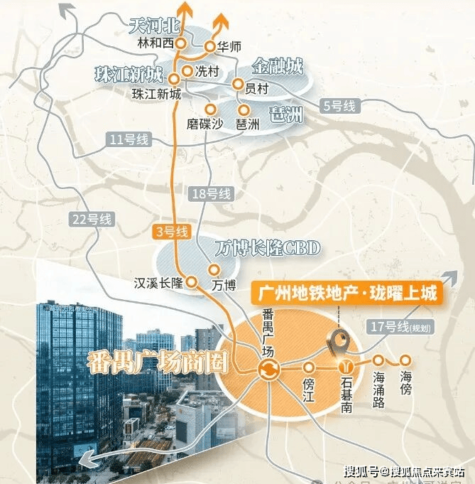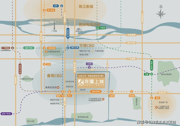 距项目2站的番禺广场,番禺区府所在地,集合番禺的行政、交通、教育、医疗、文化中心,是与北万博平齐的番禺南中心。