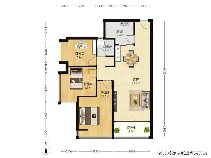 横厅南北通透,客餐厅一体化,