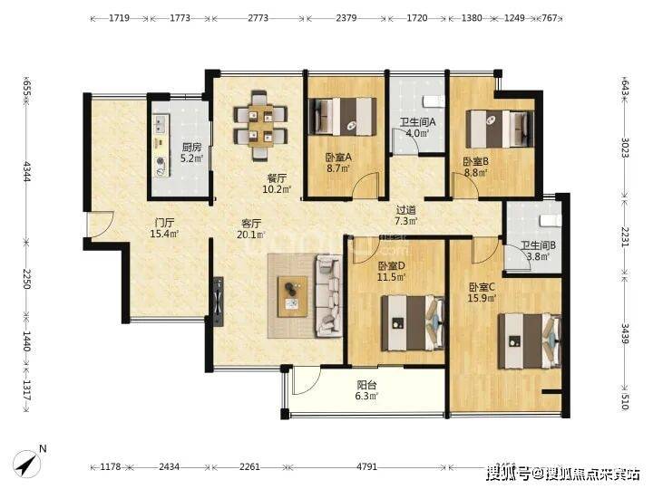 小区:豪方天际·117㎡·南4房2卫;