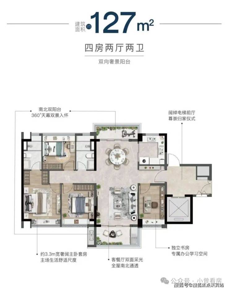 168㎡四房三卫:双主卧套房、南北双阳台,7米超大阳台尽揽园林,真正的高阶改善户型。