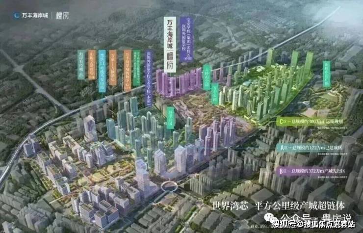 万丰区域整体城市更新项目包含A、B、C三区,合计总建面超500万平,包含商业、住宅、产业、甲级写字楼、高端酒店、学校教育、文化休闲、交通枢纽、生态公园等全维业态。