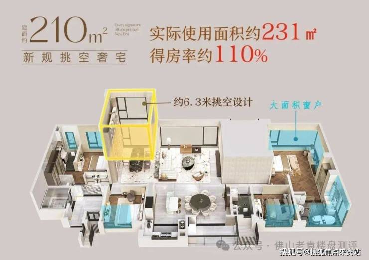 建面约210㎡户型,客厅开间约9.7米,五房三卫总裁级双套间,也可延展到六房格局。