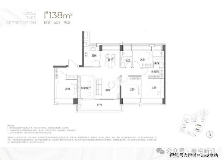 竖庭格局,西南向,基本居住功能与建面约108-110㎡4房2卫一致,但格局不一样,从目前公布的户型图上看,主要是主卧空间有了更大的提升,比如可以放更大一点的衣柜。但从位置上看,它所在的楼栋更靠近主干道,会有噪音影响。