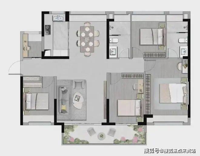 设计的是竖厅南北通透格局,客厅3.8米开间,LDKB一体化设计,四开间朝南,4个卧室分别做到了3.5米/3米/2.8米/2.7米的宽度,另外还有1个小储物间,客厅连接次卧出6.6米长的大阳台,L型厨房,卫生间干湿分离,