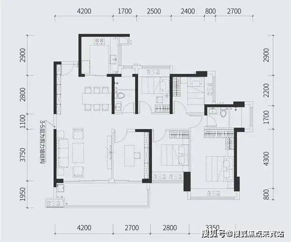 114㎡的4房2厅2卫,设计的竖厅格局,客厅3.7米开间,四开间朝南,4个卧室分别是3.1米/2.7米/2.6米/2.45米的宽度,客厅连接卧室带6.3米长大阳台,U型厨房,房,得房率:77.74%(不含赠送),有西南或东南朝向。