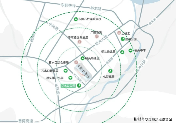 ◎三轨道:桥头坐拥R3、R17、惠州5号线延长线(规划中),三轨交融,串联东莞三大核心发展极,纵横莞惠两地,其中项目距离R3线大东路(规划)仅3公里。