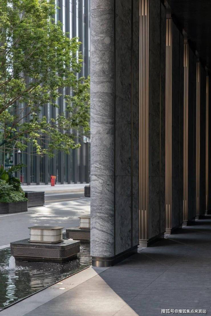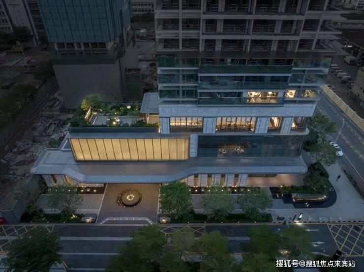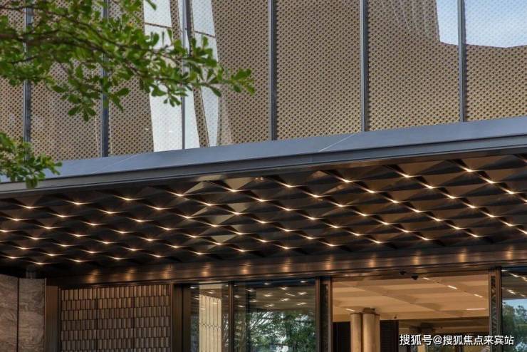 裙房部分近人尺度的造型强调出项目的品质与调性,所有材质与细节都做了精心雕琢与推敲。入口处二层玻璃体结合夜景灯光,白天可以很好地勾勒出晶莹剔透的形体,晚上灯光内透LOGO图案反射项目的文化内涵。