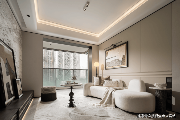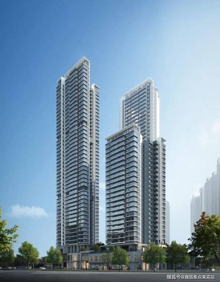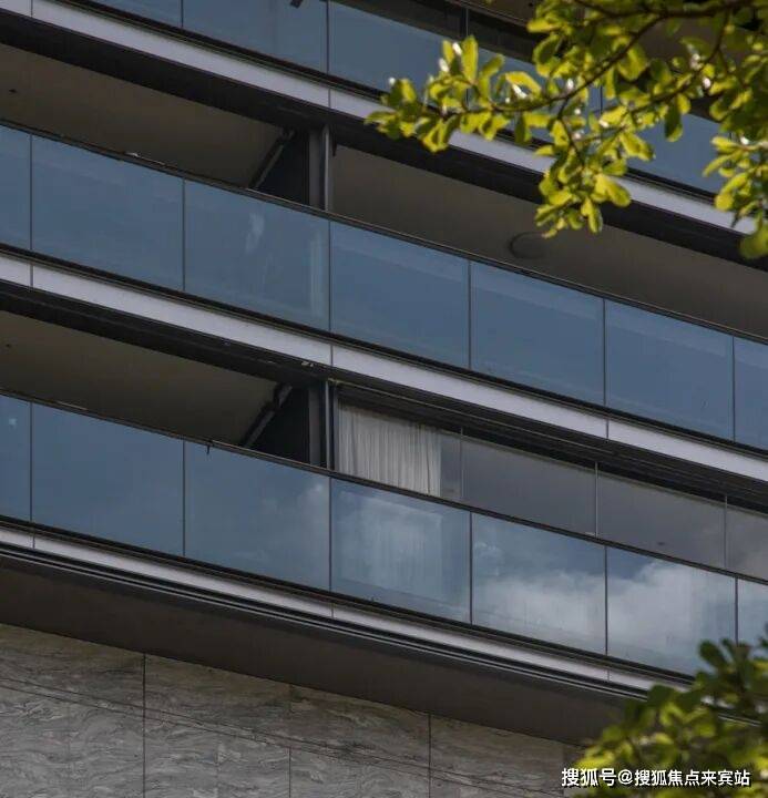 塔楼采用大面积的270°转角凸窗的形式,削弱建筑体量感,弱化建筑边际,形成与豪方天际办公楼相呼应的公建化立面效果。立面材料主要为玻璃加铝型材线条和真石漆,强调现代材料虚实结合。塔楼顶部设计了约5m高塔冠,采用夹胶彩釉玻璃,将项目专属LOGO符号编织图纹融入其中,形成视觉昭示形象。