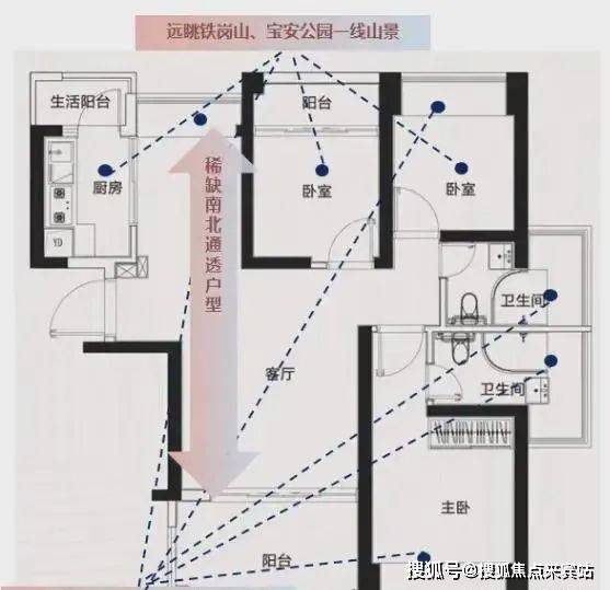 南北通:稀缺端头位,客厅、主卧东南、次卧西北,南北通透,采光、通风无忧