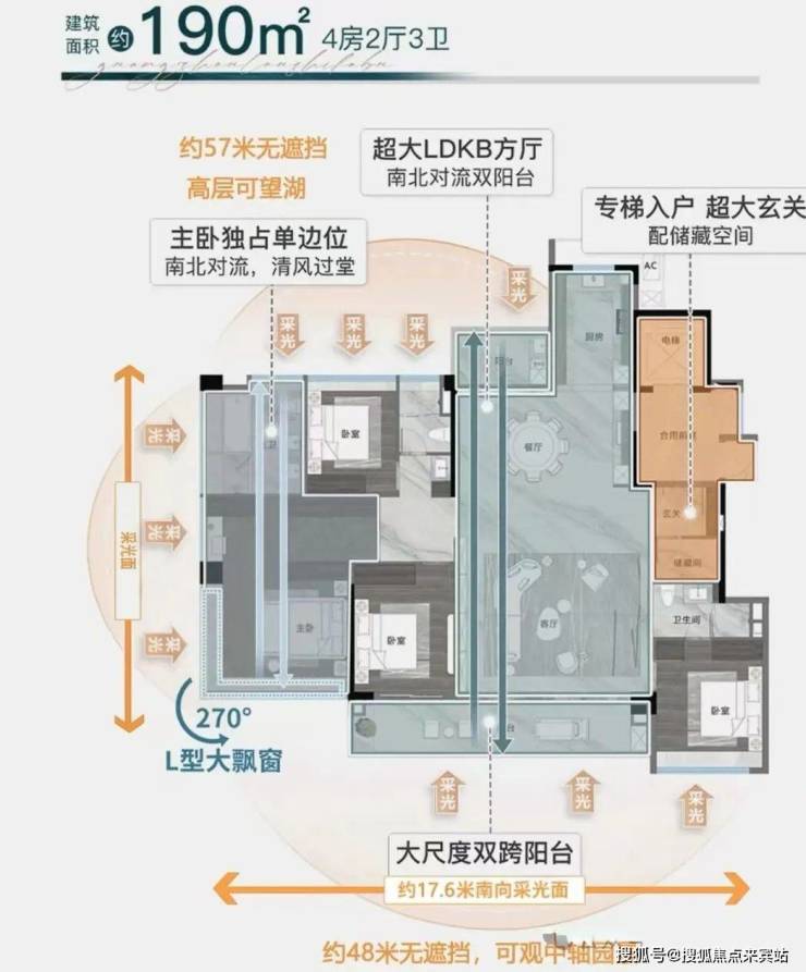 3、窗地比高达38%,主卧设置270°大飘窗。