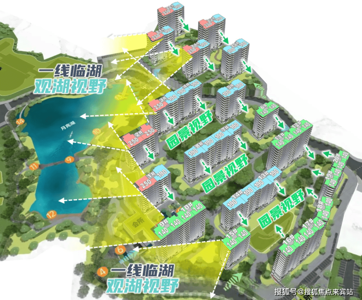 45-52米的低密度小高层,按照“前低后高”的建筑高度控制,形成朝向湖区梯级跌落的设计,大地块西北向望湖景,小地块西向往湖景