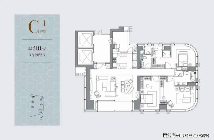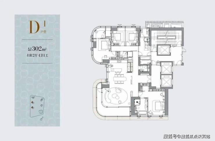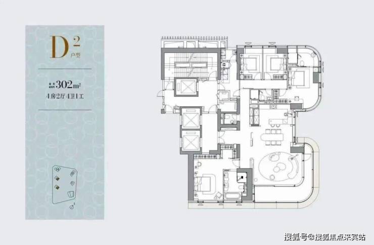 302㎡4房4卫+家政,3T2户,客餐厅约8米进深、7米开间,L型阳台。