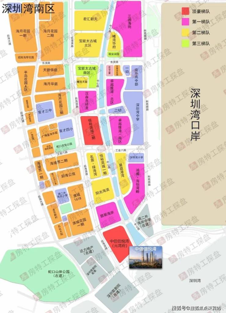 深圳湾南区主要有:吉祥龙、君汇新天、太古城南北区、曦湾天馥、恒裕滨城一期、恒裕滨城二期、阳光海滨、绿海湾、翡翠海岸、鸿威海怡湾畔、皇庭港湾,卓越维港南北区,三湘海尚、颐安阅海、曦湾华府等十六个楼盘,还有中信元湾府和达力在建。