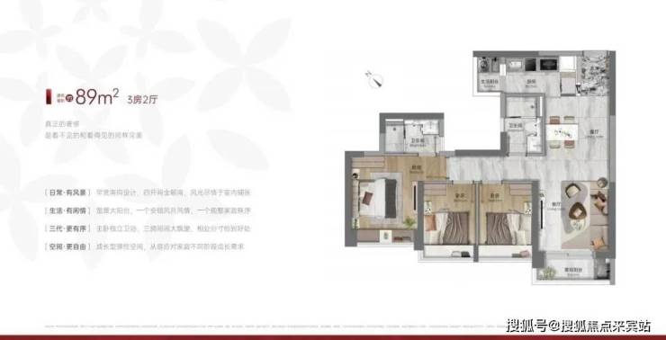 建面87-89平三房两卫,带主套设计,89平四开间朝南,三个房间带有大飘窗,总价330-380万左右。