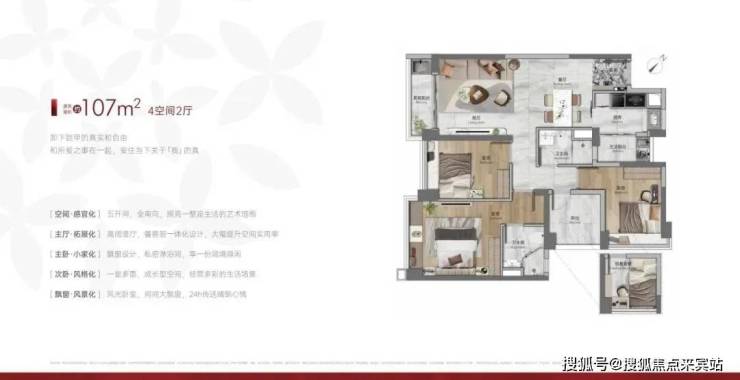 建面107平四房两卫,五开间朝南,经典竖厅设计,餐客厅一体化,每间房都有赠送大飘窗,总价420-470万左右。
