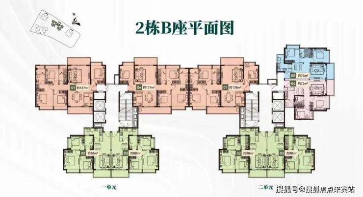 2栋B座一单元01、04户型、2栋B座二单元01户型:面积约为137-138㎡的4房2厅2卫