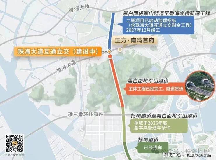 未来周边小区业主即可在该区域完成调头,避免了绕行前行调头的问题,黑白面将军山隧道至香海大桥:2024年10月16日,官方公布了该段及珠海大道互通立交剩余工程的招标信息,计划2027年12月竣工。