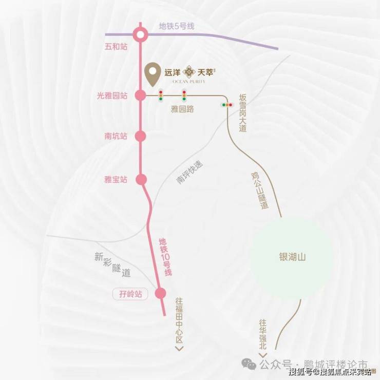 3个红绿灯到福田10号线纵向串联坂雪岗、福田CBD;5号线横向串联蛇口、前海、西丽、布吉;电梯下楼无缝进站,3站到福田,1站到五和。