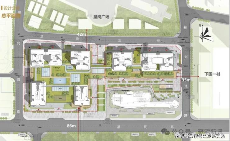 项目一期由福民路、皇岗二街、皇岗四街、皇岗五街围合而成,总占地面积约3.14万㎡,总建筑面积约27.3万㎡,住宅建面约为20.3万㎡,商业建面约为7万㎡;整个项目以“立于城市中轴,缔造时代标杆”为核心理念,旨在构建一个融合现代与历史人文特色的城市大综合体。