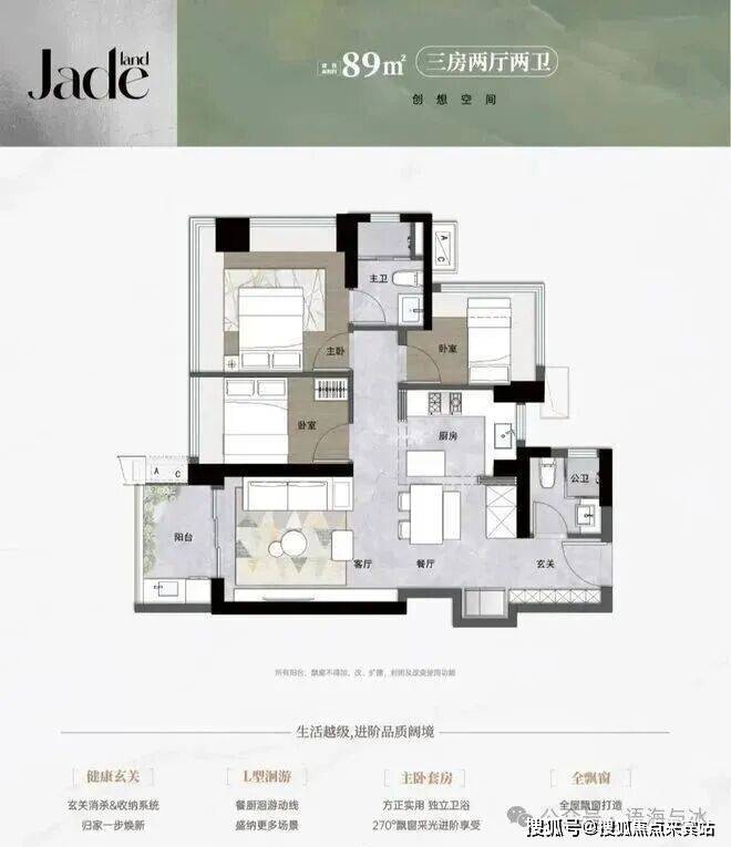 89㎡的3房2厅2卫,设计的是经典竖厅格局,进门入户玄关,LDKB一体化,S墙设计预留冰箱卡槽位,三开间朝南,主卧+1个次卧270度飘窗,L型灵动式厨房,卫生间干湿分离,得房率约92%(包含赠送),西南或东南朝向。