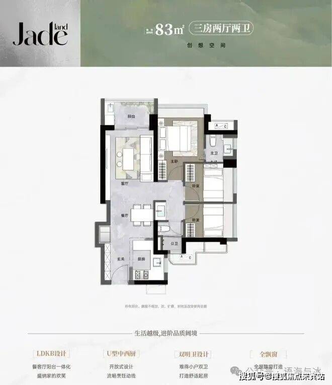 83㎡的3房2厅1.5卫,设计的是竖厅格局,进门入户玄关,LDKB一体化,S墙设计预留冰箱卡槽位,U型厨房,主卫少了淋浴,公卫三段式分离,得房率约92%(包含赠送),阳台西北朝向。