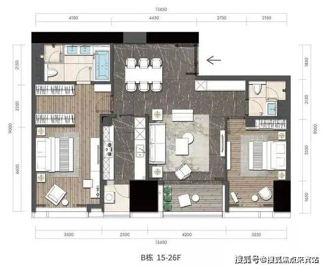 Ø端头户型主要朝向为正东向,户型方正双面采光布局;