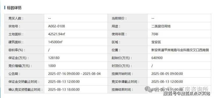 7月16日,深圳公共资源交易中心挂牌一宗新宅地,宗地号A002-0108,地块位于新安街道甲岸南路与金科路交叉口西南侧。