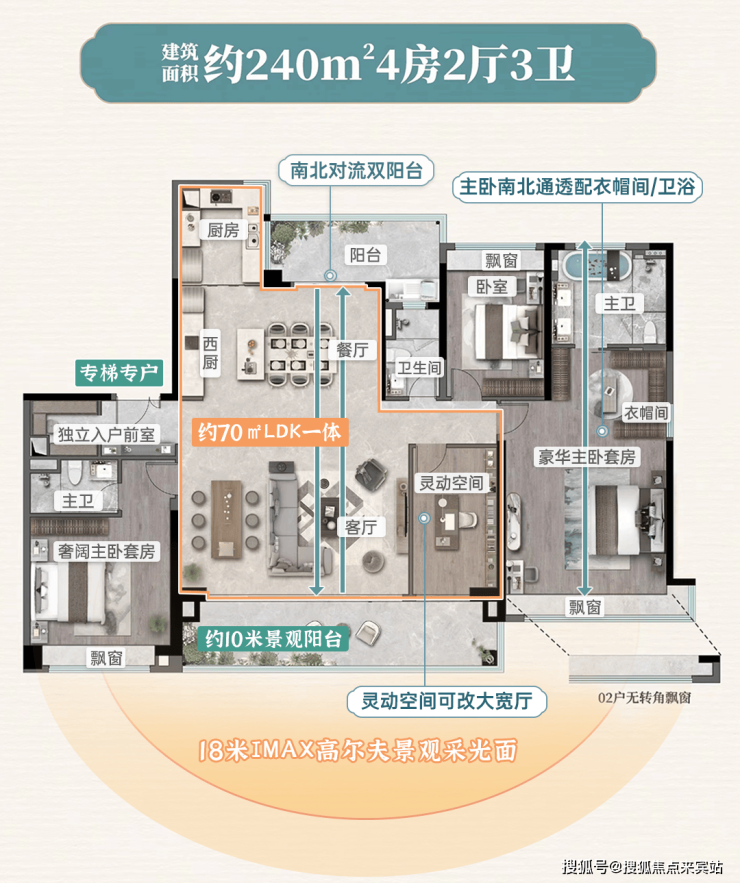 该户型为专梯专户设计,南北对流双阳台、超18米IMAX采光面只是标配,其各功能区空间尺度、舒适性更上一层楼。