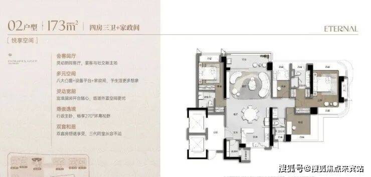 173m²的4房2厅3卫+家政间,设计的是竖厅类双龙抱珠格局,独立电梯厅入户约8.13㎡,客厅5.55米开间,LDKB一体化设计,主卧套房270°环幕凸窗+私享阳台,八大凸窗+设备平台+家政间,