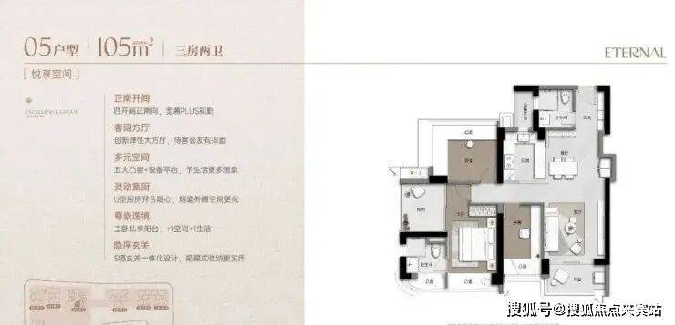 105m²的4房2厅2卫,设计的是经典竖厅格局,客厅3.4米开间,LDKB一体化大方厅,S墙设计预留冰箱卡槽位,四开间朝南,动静分区,五大凸窗+设备平台,