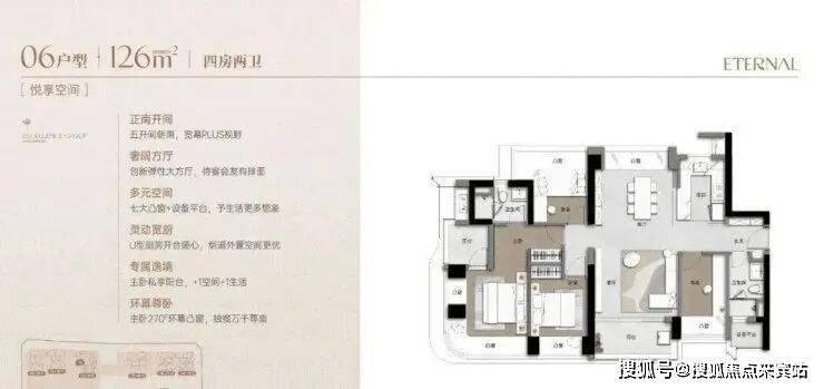 126m²的4房2厅2卫,设计的是竖厅南北通透格局,客厅3.9米开间,客餐厅分离化设计,五开间朝南,主卧套房270°环幕凸窗+私享阳台,七大凸窗+设备平台,