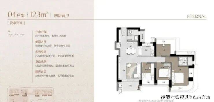123m²的4房2厅2卫,设计的是经典竖厅格局,客厅4.2米开间,LDKB一体化弹性大方厅,S墙设计预留冰箱卡槽位,四开间朝南,动静分区,主卧套房270°环幕凸窗,