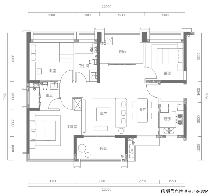 C户型建面约120㎡,3+1房2厅2卫