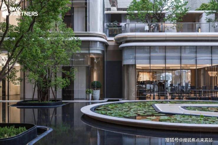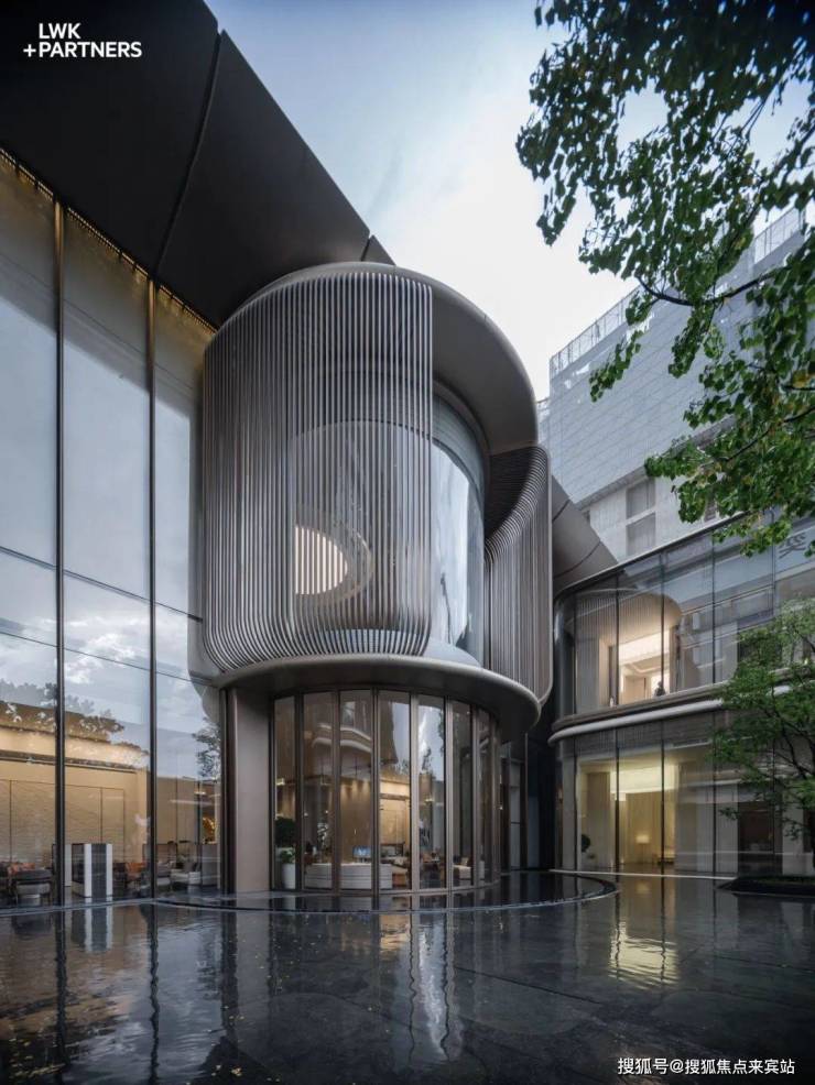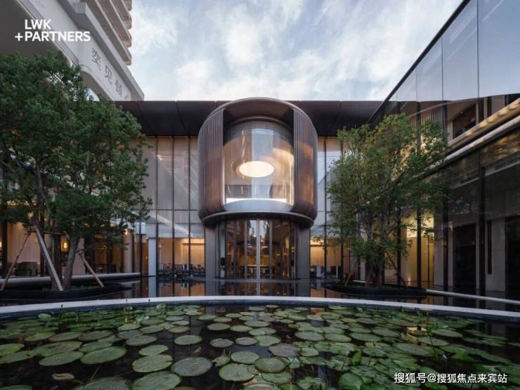 穿过大堂,2,000㎡ 四季立体会所通过巨幅落地玻璃延展景观视野,目之所及尤其静雅。漂浮的半圆形城市会客厅锚定了整个浮岛水院的中心,纤细不锈钢格栅勾勒了悬浮体量的造型,形成了一种戏剧性的表达。