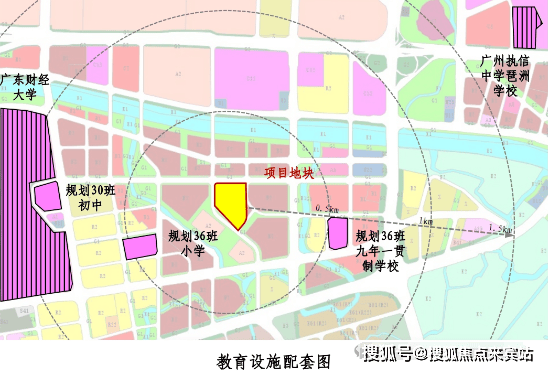 3、国际校圈:500米左右范围处规划一所36班小学、一所36班九年一贯制学校+国际私立+广东财经大学