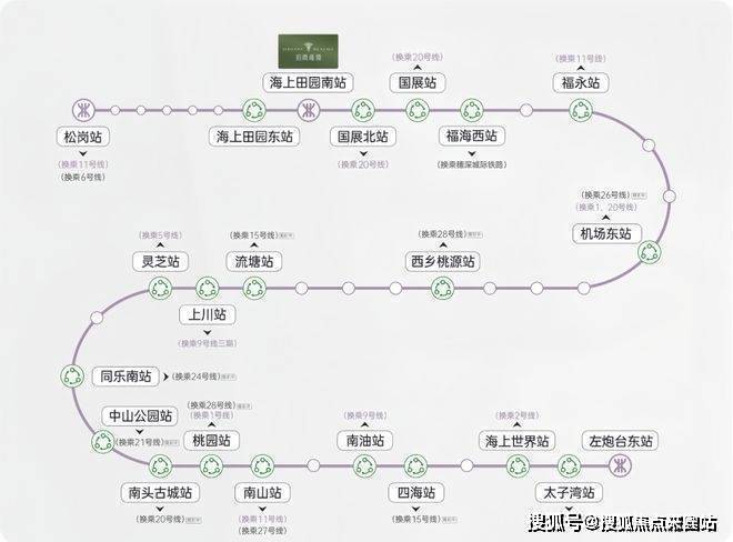 ‼换乘王:规划设有20个换乘站点(含规划)地铁12号线共设33个站点,可换乘1/2/5/9/11/20号线等多条线路,规划总换乘站点达20个,快速通达宝安中心、南山科技园、蛇口海上世界等,通勤无忧。• 国际会展中心:1站直达20号线换乘站• 南山/车公庙/福田站:5站直达11号线换乘站