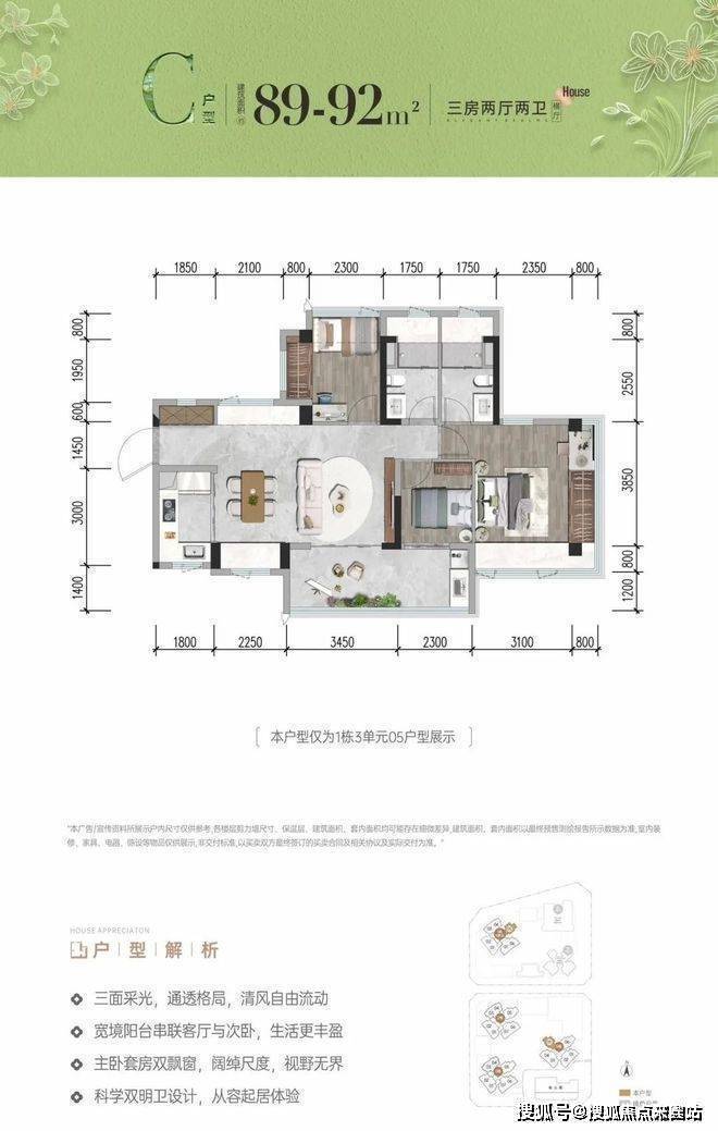 89-92㎡的3房2厅2卫,B户型,设计的是竖厅格局,客厅3.45米开间,LDKB一体化,S墙设计预留冰箱卡槽位,三开间朝南,动静分区,主卧270无边转角飘窗,3个卧室分别做到了主卧18.1㎡/次卧9.44㎡/次卧5.98㎡(包含墙体飘窗),客厅连接次卧出5.75米长的大阳台,U型厨房,公卫三段式分离,得房率约93-99%(包含赠送),西南或东南朝向。