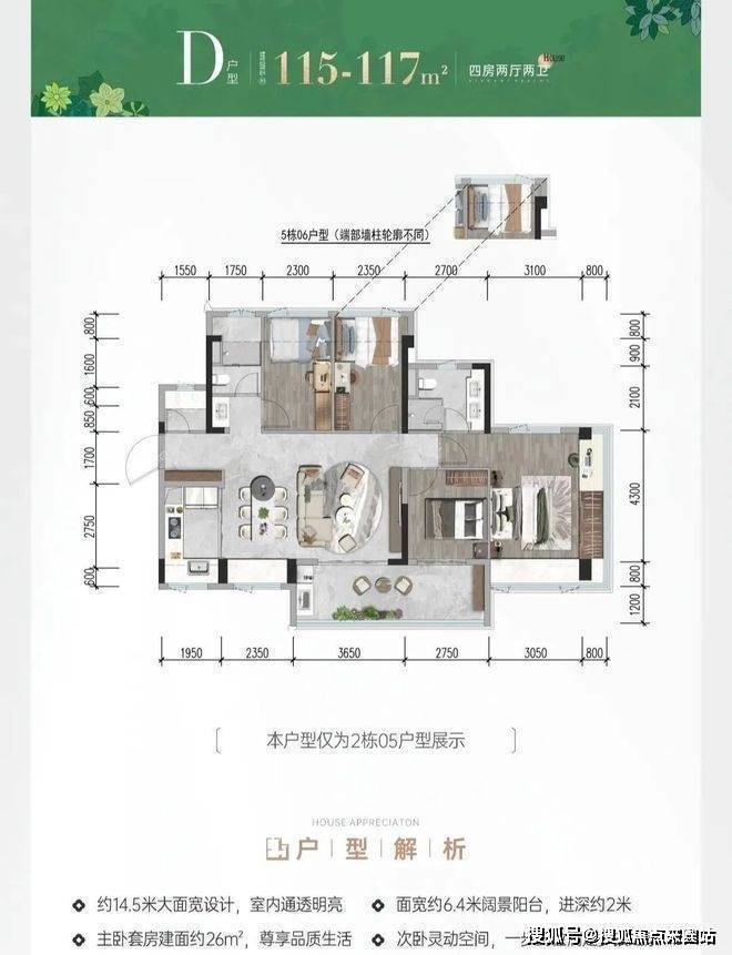 115-117㎡的4房2厅2卫,横厅南北通透格局,客餐厅6米开间,主卧套房双飘窗,4个卧室分别做到了主卧20.83㎡/次卧8.74㎡/次卧8.93㎡/次卧8.25㎡(含飘窗),客厅连接次卧出12.8㎡的巨幕大阳台,得房率约78.9%(不含赠送),阳台主朝东南向。加上赠送后得房率约98.44%。
