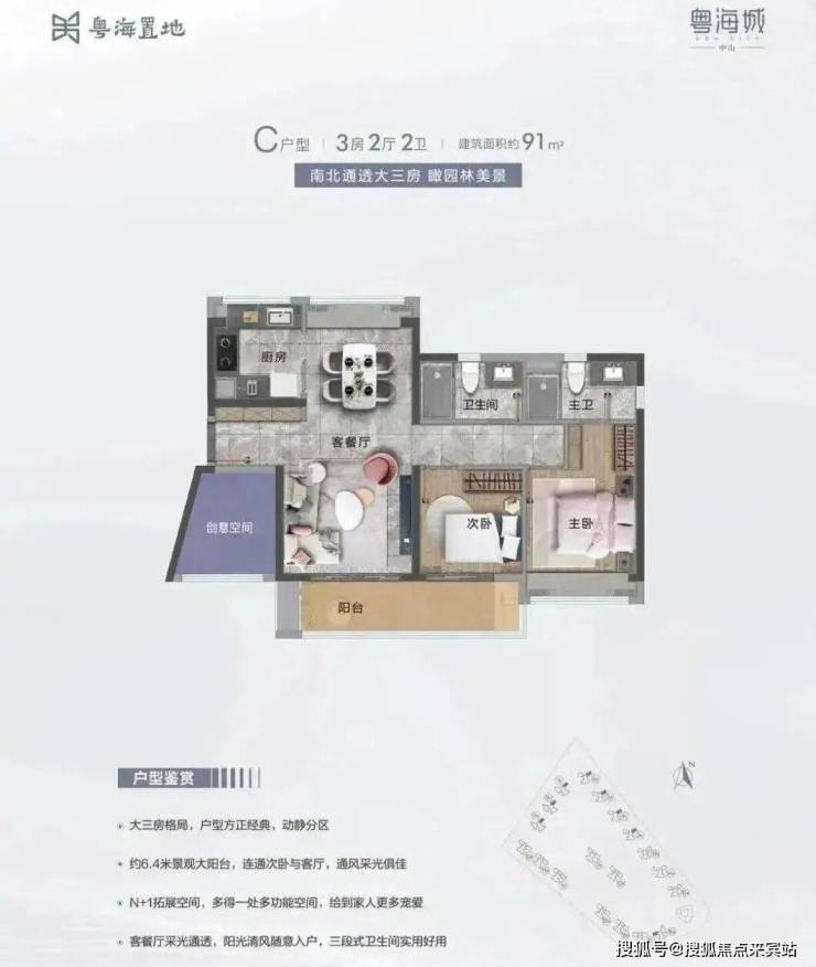 C户型:建面约91m² 3房2厅2卫