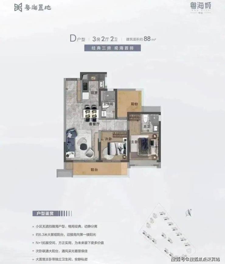 D户型:建面约88m² 3房2厅2卫