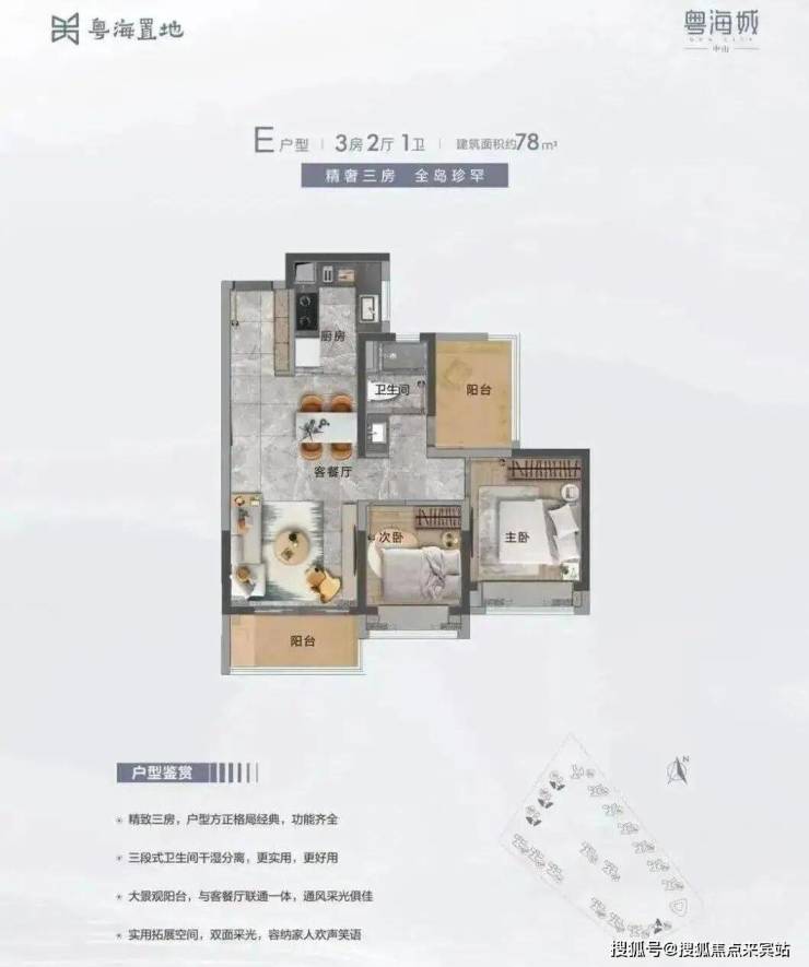 E户型:建面约78m² 3房2厅1卫