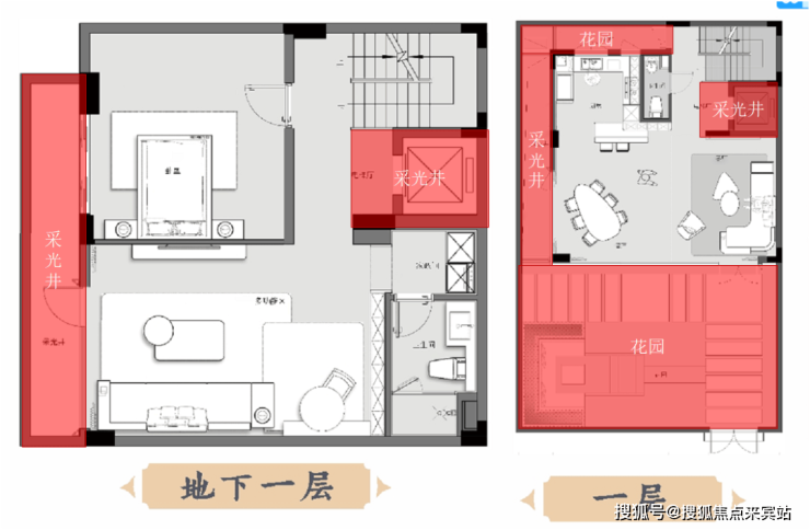 部分戶型規劃為下沉式庭院,打造雙層院落,以及配有前後花園,有天有地,舒適生活由此起。