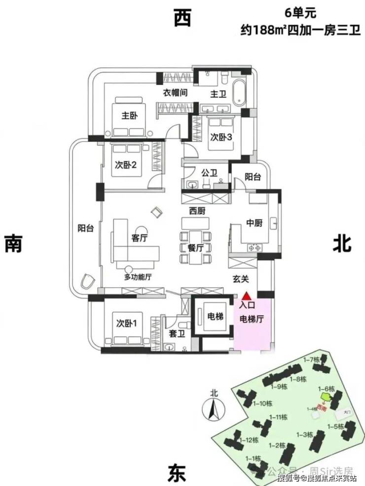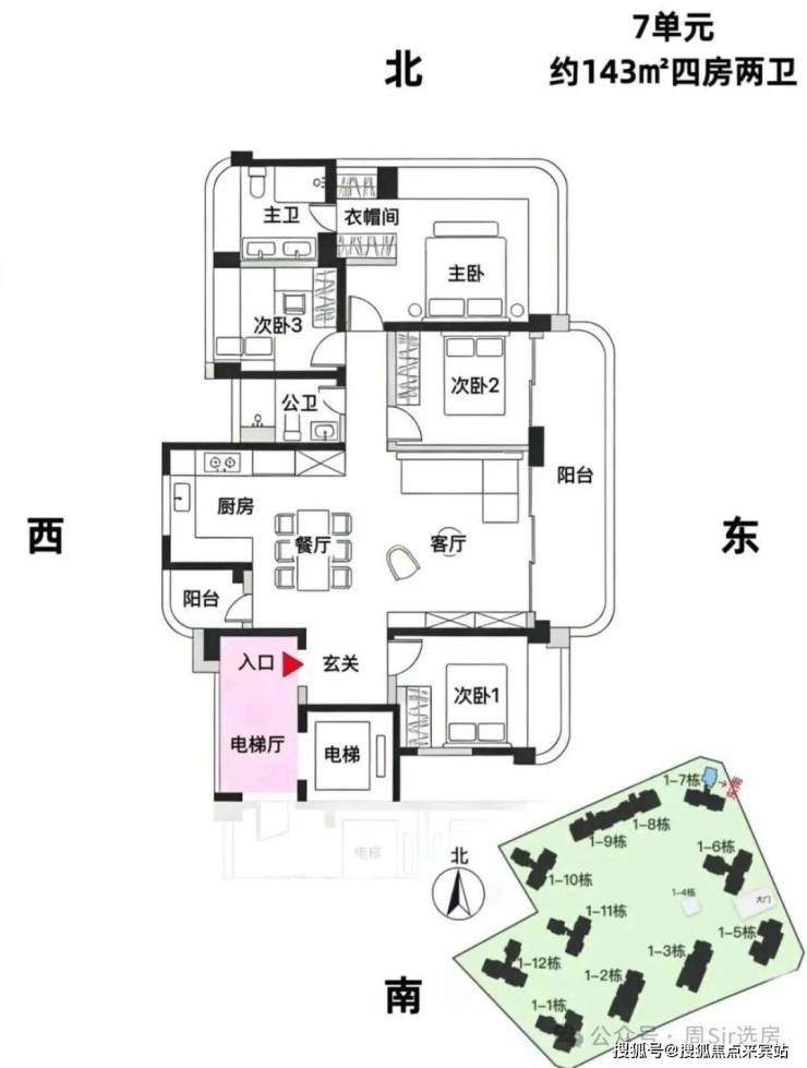 项目采用围合式点式错位布局,2T2户(板楼)和3T3户(塔楼)相结合的设计,确保了户户朝南的优质采光和通风条件。其中,2/3/5/8/9栋为2T2户板楼,产品面积段为193-253-332㎡的大平层;1/6/7/10/11/12栋为3T3户塔楼,产品面积段为140-168-190㎡的4房。这种设计既保证了户型的稀缺性和高端性,又满足了不同客群的需求。