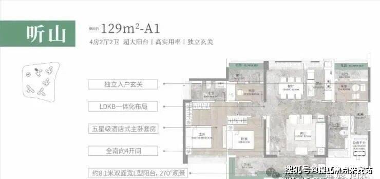 建面约129㎡听山户型,阳光玄关设计,兼容了户内的私密性,储物空间又是全明采光,也符合广东地区对风水的理解,舒适性和实用性都考虑到。