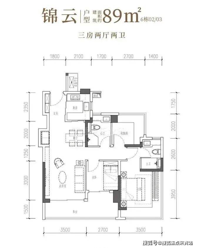 89㎡的3房2厅2卫,6栋02/03户型,设计的是经典竖厅格局,客厅3.5米开间,LDKB一体化,S墙设计预留冰箱卡槽位,三开间朝南,动静分区,主卧+次卧270°无柱转角飘窗,分别做到了主卧15.25㎡/次卧7.56㎡/次卧6.48㎡(包含墙体飘窗),U型厨房烟道外置,卫生间干湿分离,得房率约97.47%(包含赠送),客厅连接次卧出大阳台约11.46平,西南或东南朝向。主要区别在于次卧跟主卫空间。
