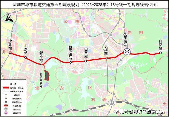 18号地铁线,这是一条东西向的地铁线路,规划串联宝安海洋新城、光明城、观澜、平湖金融城,全长61.6公里,设站27座,其中一期工程沙井站-白花站,设站8座,全部为地下站,设计时速120公里,