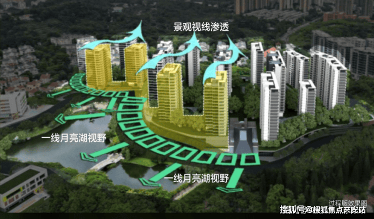 45-52米的低密度小高层,按照“前低后高”的建筑高度控制,形成朝向湖区梯级跌落的设计,大地块西北向望湖景,小地块西向往湖景