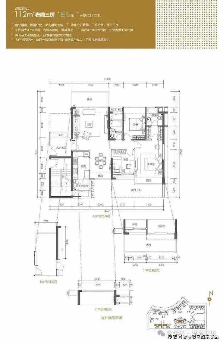 112㎡的3房2厅2卫,设计的是竖厅南北通透格局,客厅4.5米超大开间,主卧3.6米开间,带大入户花园,L型厨房。