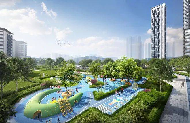 景观泳池(有成人泳池+儿童泳池)*儿童友好公园*活力阳光慢跑环。